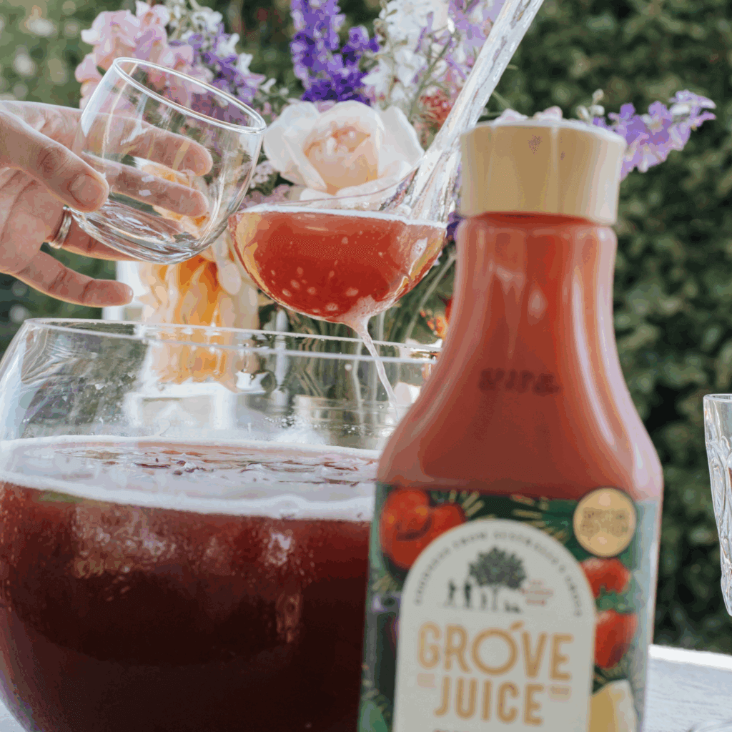 - In a large punch bowl or drink dispenser, pour in the Grove juice.